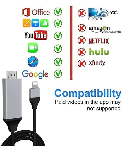 - [التطبيقات المدعومة] يدعم محول كابل HDMI هذا مكالمات فيديو فيس تايم وسكايب وواتساب؛ ويدعم بث مقاطع الفيديو والصور والألعاب على فيسبوك ويوتيوب وتويتر وانستجرام وريديت وبينتيريست وسناب شات واي دي ام بي ومايكروسوفت اوفيس وما إلى ذلك. [يرجى ملاحظة] بسبب تدابير حماية حقوق الطبع والنشر، قد لا تدعم كيبلات ايفون اتش دي ام اي مقاطع الفيديو المدفوعة في نتفليكس واتش بي او جو واكس فينيتي بلاير وهولو ودايركت تي في وفودو وغيرها من التطبيقات.
