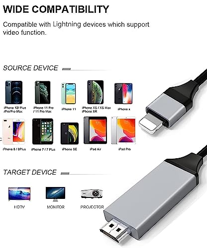 - [أجهزة متوافقة على نطاق واسع] تم تصميم كيبل ايفون إلى HDMI خصيصًا لايفون ايباد ومتوافق مع ايفون 13، 12 ميني، 12، 12 برو، 12 برو ماكس، 11، 11 برو، 11 برو ماكس، اس اي 2020، اكس ار، اكس اس، اكس، 8 بلس، 8، 7، -باد. يدعم نظام اي او اس 13 وأنظمة التشغيل السابقة. لا داعي للقلق بشأن ترقيات النظام.