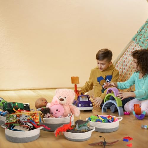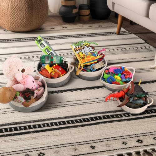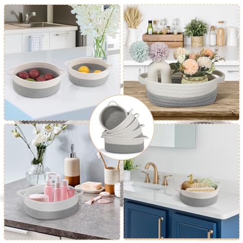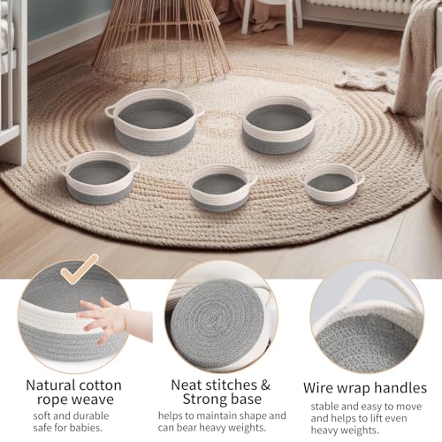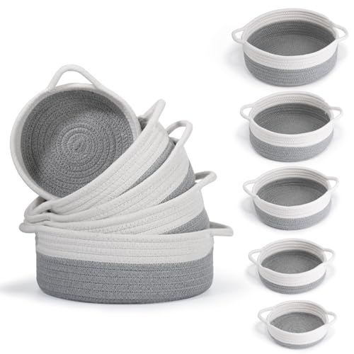 VOOWO - فاوو مجموعة من 5 سلال الحبال دائرية صغيرة منسوجة للتخزين سلة هدايا فارغة القطنية للتنظيم ملفوفة لديكور المنزل رف تخزين العاب مونتيسوري ابيض ورمادي
