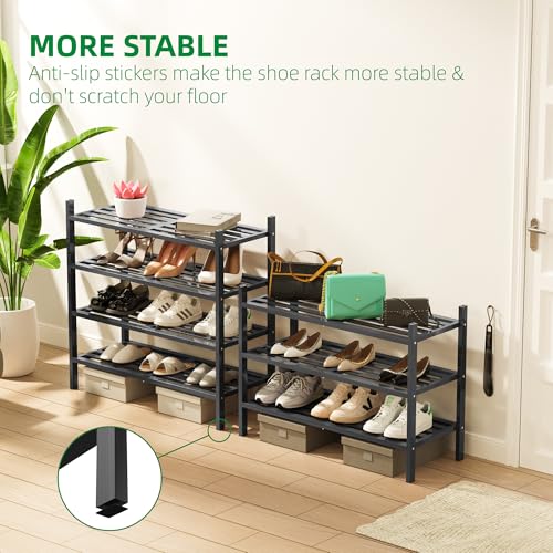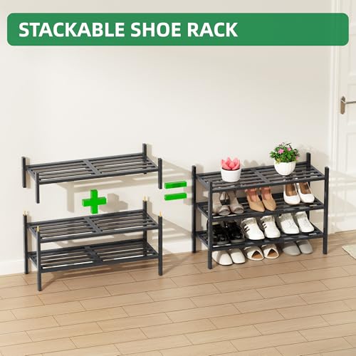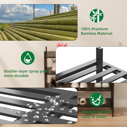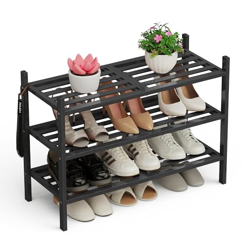 VOPOG - رف احذية من فوبوج، رف احذية من الخيزران من 3 طبقات لمدخل الباب الامامي مع بوق احذية، رف احذية منظم قابل للتكديس للمدخل والرواق والحمام ومنظم احذية للخزانة - اسود مطور