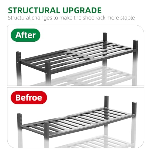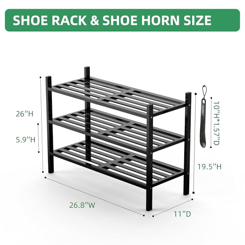 - سعة كبيرة وموفرة للمساحة: تصميم من 3 طبقات، يوفر مساحة واسعة لحمل حوالي 9 أزواج من الأحذية ويناسب 3 أزواج من الأحذية على كل رف. يسمح لك المقاس 27 × 11.1 × 19.4 انش بوضعه في الزوايا الصغيرة أو الممرات الضيقة، ولا يشغل مساحة أكبر