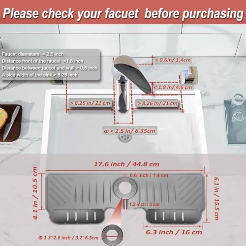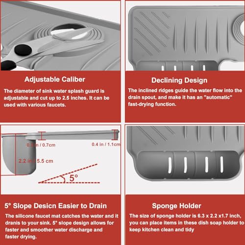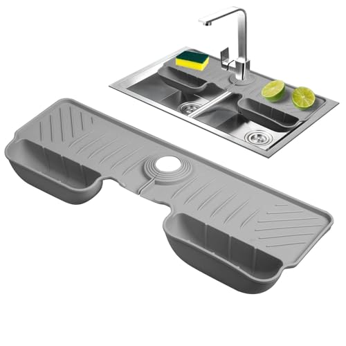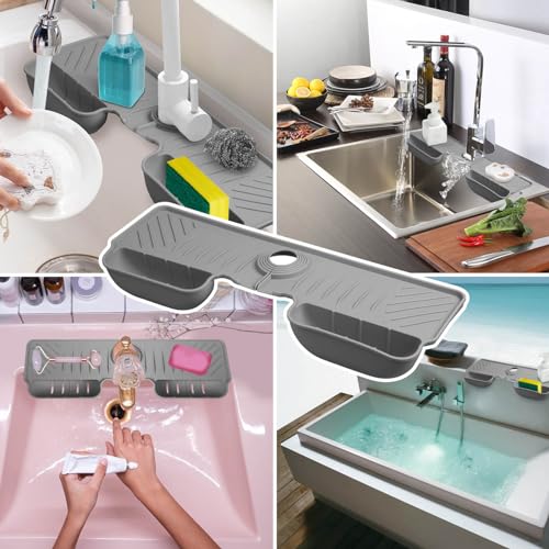 VPASION - صينية سيليكون لالتقاط تساقط الماء من مقبض الحنفية وسجادة سيليكون للحنفية مع 2 حامل إسفنجة لاكسسوارات حوض المطبخ وسجادة تجفيف لأسطح الحمام تعمل كحاجز لرذاذ الماء من في باشن، رمادي