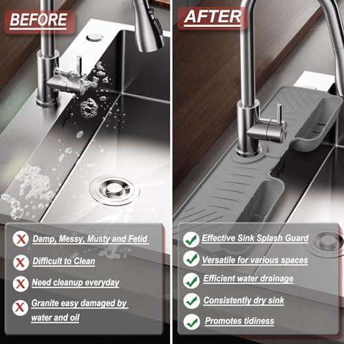 - 【حافظ على سطح الحوض نظيفًا وجافًا】وسادة السيليكون للحنفية مصممة بشكل جديد لتجميع وتصريف رذاذ الماء، مما يساعد على تحسين حوض المطبخ وسطح الحمام بطريقة سهلة وموفرة للجهد. وهذا يعني أنك لن تعانين من البلل أبدًا أو تراكم أي بقع ماء بجوار الحوض والحنفية. لن داعي للقلق بشأن بقاء الماء على السجادة أو على سطح الحوض.