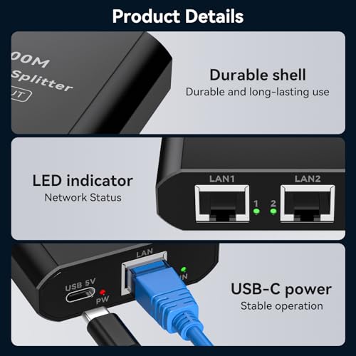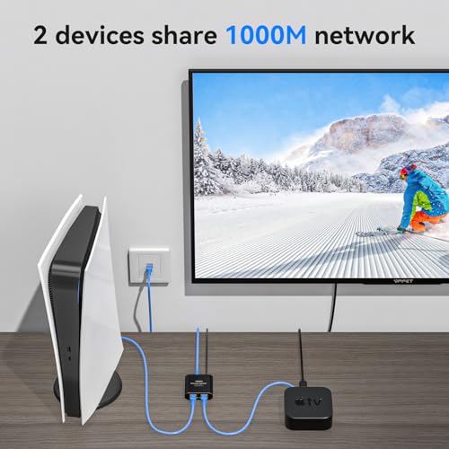 VPFET - مقسم ايثرنت جيجابت VPFET 1 إلى 2 عالي السرعة بسرعة 1000 ميجابت في الثانية، مفتاح شبكة بمنفذين مع كابل طاقة USB-C، مقسم RJ45 مناسب لأجهزة الراوتر/المحاور/أجهزة التلفاز/أجهزة استقبال القنوات وغيرها