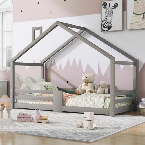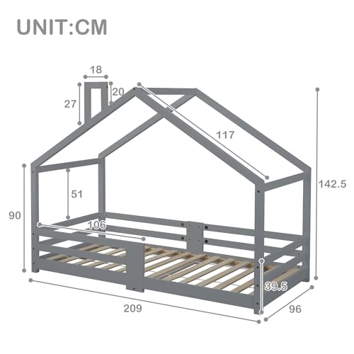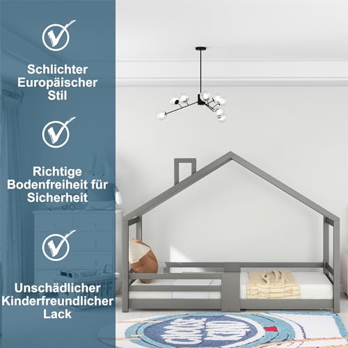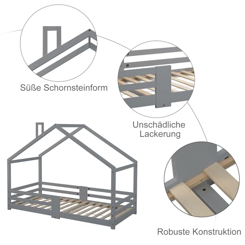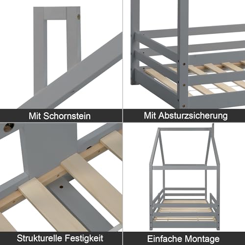 VRYGLEN - سرير أطفال مع مدخنة من فريجلين، سرير أرضي مع حماية من السقوط بإطار قوي، سرير منزلي من خشب الصنوبر للأطفال، لون رمادي، مقاس 90 سم × 2.0 متر