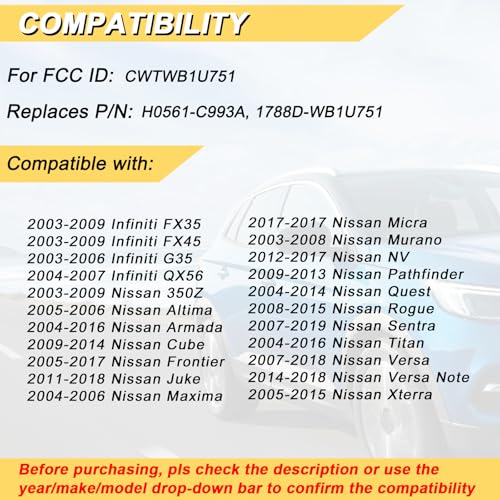- 【الاستبدال】متوافق مع نظام التعرف التلقائي على الوجه: CWTWB1U751؛ رقم الجزء P/N: H0561-C993A, 1788D-WB1U751؛ التردد: 315 ميجاهرتز؛ يرجى التأكد من احتواء جهاز التحكم عن بعد الأصلي على نفس عدد الأزرار للتوافق التام.