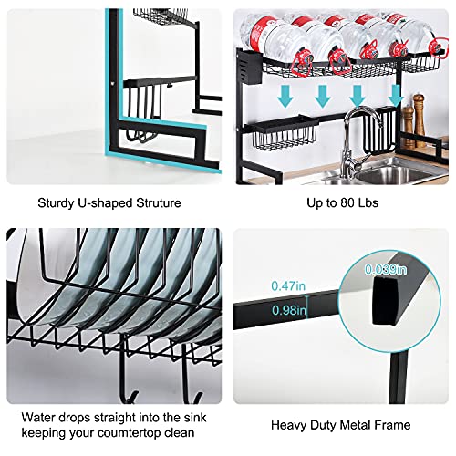 - 👍【هيكل متين ومقاوم للتآكل】- رف الأطباق فوق الحوض مصنوع من هيكل معدني ممتاز ومتين مع لمسة نهائية مطلية باللون الأسود، لا داعي للقلق بشأن الصدأ. 4 أكواب شفط غير قابلة للانزلاق في أسفل القدم لتحسين وضع الرف، وجعله لا يميل للأمام أو يهتز. تأتي بتصميم قدم منحنية ثابتة يمكنها تحمل ما يصل إلى 80 باوند.