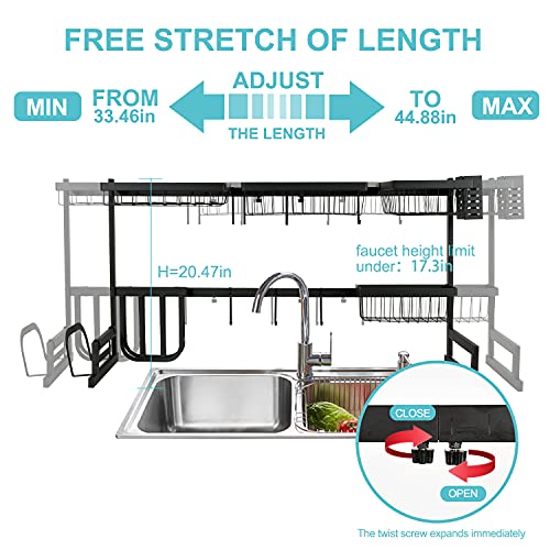 - 👍【رف قابل للتعديل، مناسب لمعظم الأحواض】- اضبط طول رف الأطباق فوق الحوض (الطول الإجمالي من 33.4 انش إلى 44.9 انش) ليناسب الأحواض المختلفة بغض النظر عن الحجم الكبير أو الصغير. يجب أن يكون طول الحوض ≤ 32.5 انش، ويجب أن يكون ارتفاع الصنبور ≤ 17.3 انش. يرجى القياس أولاً قبل الشراء.
