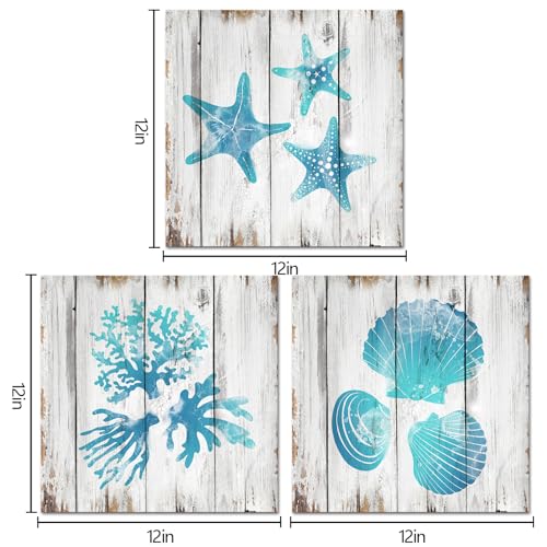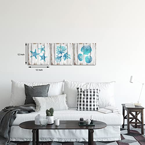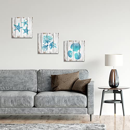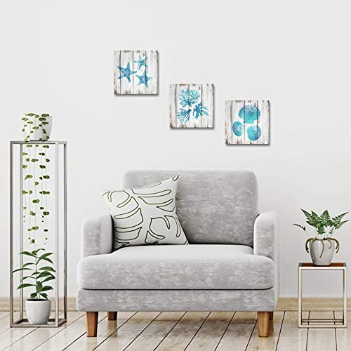 VVOVV Wall Decor - ديكور حائط من VVOVV، صورة جدارية مطبوعة على قماش خشبي على قماش بلون ازرق مخضر ونجم البحر المرجاني مقاس 30 × 30 سم × 3 لوحات مؤطرة
