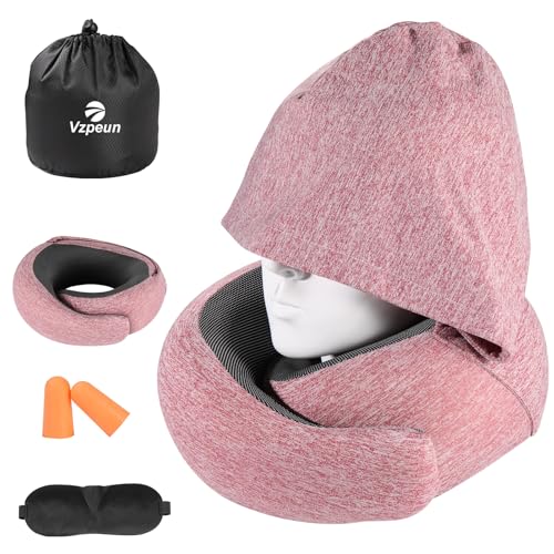 Vzpeun - وسادة سفر بغطاء للراس من فيزبون - وسادة رقبة من الميموري فوم للطائرة والمكتب والسيارة والرحلات الطويلة والرحلات البرية، تتضمن قناع عين وسدادات اذن (احمر)