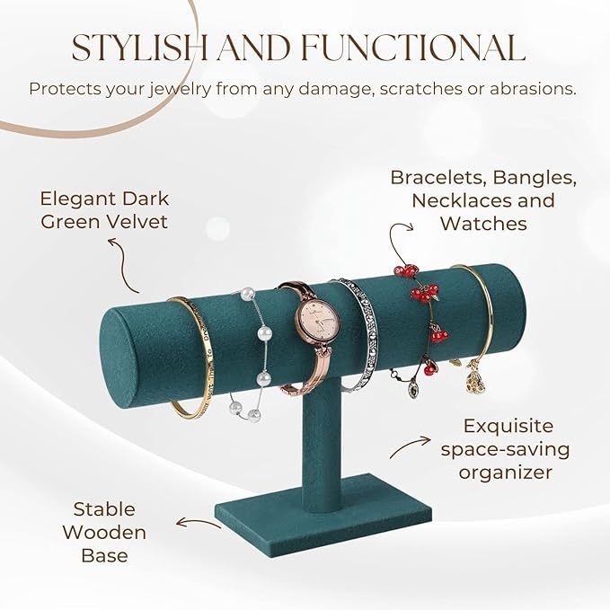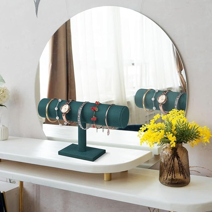 - منظم أساور قطيفة: يتميز الحامل على شكل حرف T بلمسة نهائية من الكتان الأصفر الناعم، ولا يضيف حامل السوار لمسة من الفخامة فحسب، بل يحمي مجوهراتك أيضًا من الخدوش والتلف.