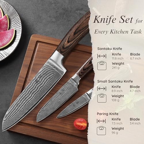 - مزايا السكين - تتضمن مجموعة السكاكين الاحترافية المصنوعة من الصلب الدمشقي سكين سانتوكو (السكين: 30 سم/ الشفرة: 17 سم)، سكين سانتوكو صغير (السكين: 23.5 سم/ الشفرة: 12.5 سم) وسكين مكتب (السكين: 19 سم/ الشفرة: 8.5 سم). السكاكين في مجموعة سكاكين المطبخ هذه هي المعدات الأساسية المثالية للمهام الصغيرة والكبيرة في المطبخ.