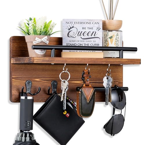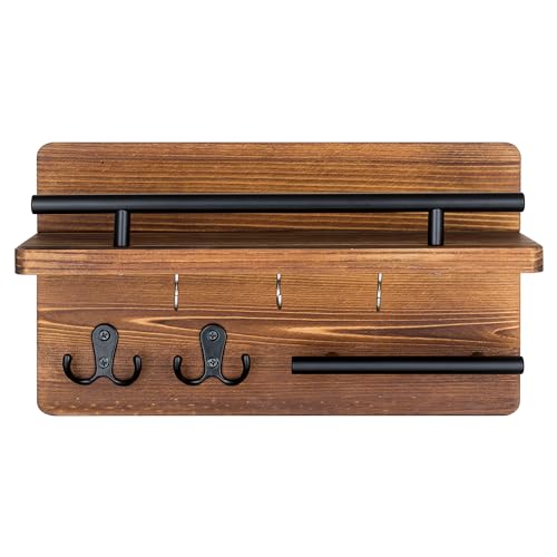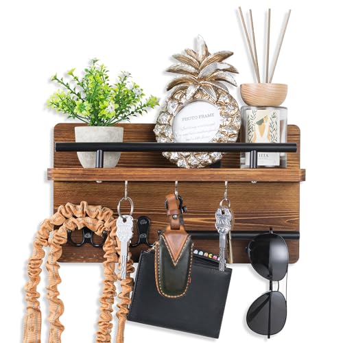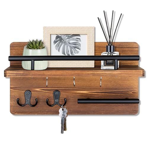 Walasis - حامل مفاتيح منظم يثبت على الحائط - رف مع خطافات للمدخل شماعة خشبية بتصميم ريفي للمحفظة والمعطف وسلسلة الكلاب صنوبر بني