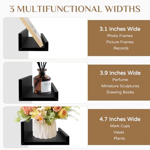 - 3 أرفف بعرض مختلف - يتيح لك رف الحائط الطويل هذا عرض مجموعة متنوعة من العناصر. عرض 3.15 انش مثالي لعرض إطارات الصور أو الصور، في حين أن العرض 3.94 انش مثالي لعرض العناصر الزخرفية الصغيرة أو العطور. بالنسبة للأشياء الأكبر مثل الكتب أو السجلات أو الألعاب، يمكنك استخدام العرض الواسع 4.72 انش.