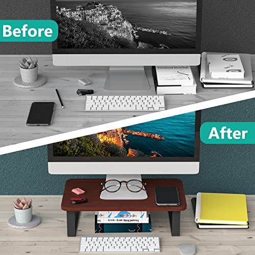 - التصميم: رف خشبي متين كبير مقاس 14.6 × 9.3 انش يناسب معظم شاشات العرض المسطحة واللاب توب والطابعة، ويدعم وزن يصل إلى 44 باوند (20 كجم).