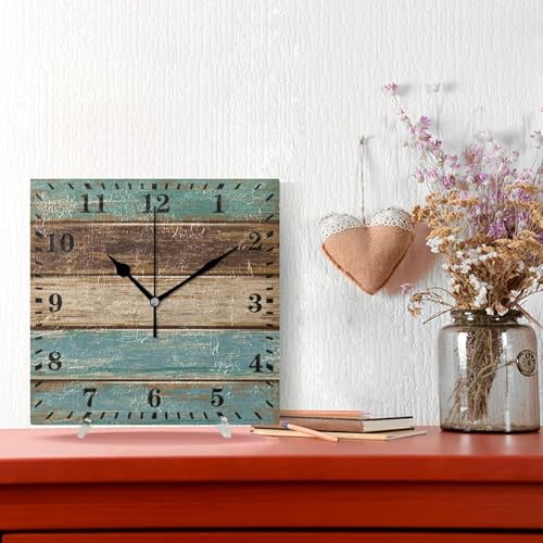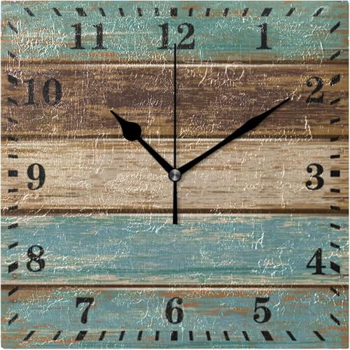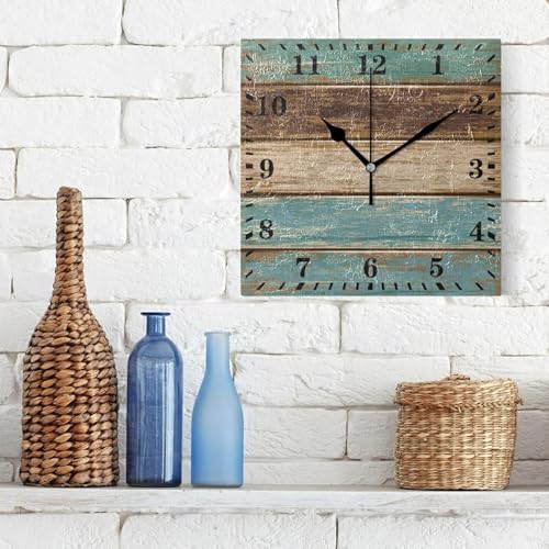 Generic - ساعة حائط بلون اخضر مخضر وبني ريترو بنمط ريفي خشبي، ساعة معلقة صامتة بدون تكتكة، ساعة مربعة لغرفة المعيشة والمطبخ وغرفة النوم