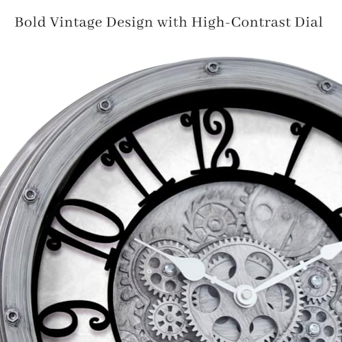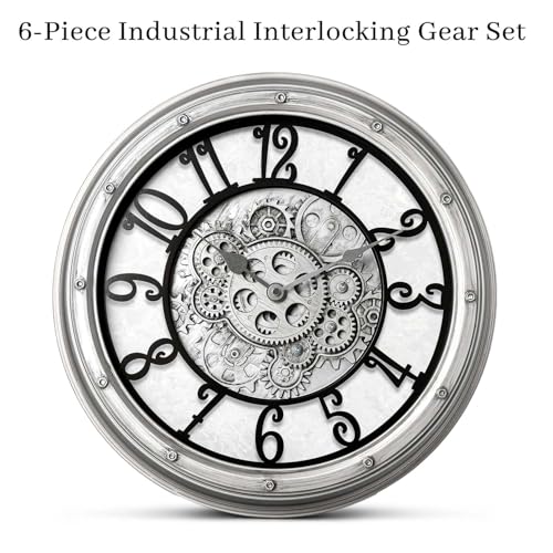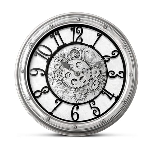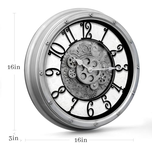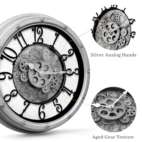 TIMESS - ساعة حائط مع تروس متحركة، ساعة ستيمبنك الصناعية العتيقة 16 انش صامتة بدون تكتكة، اطار رترو انالوج يعمل بالبطارية ديكور ميكانيكي ريفي لغرفة المعيشة والمنزل والمكتب والدور العلوي (فضي)