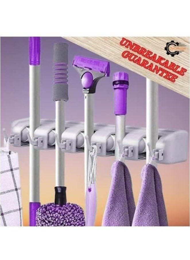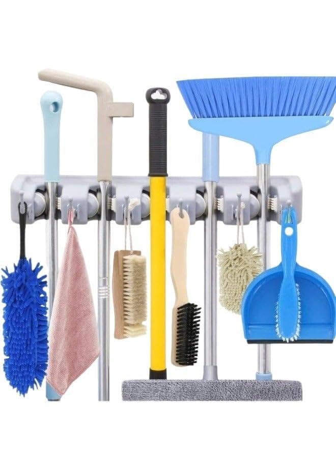 generic - منظم حامل المكنسة والممسحة يثبت على الحائط | رف ادوات تنظيف من 5 فتحات مع خطافات للتخزين في المنزل والمرآب