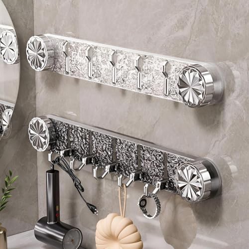 - يتميز رف الخطاف الأنيق المثبت على الحائط بلمسة نهائية شفافة من الكريستال الفضي مع أغطية طرفية مزخرفة بالزهور، مما يمزج بين الفخامة والعملية لتعزيز التصميمات الداخلية الحديثة أو التقليدية، بينما توفر الخطافات المعدنية الستة المطلية بالكروم مساحة تعليق متينة للمناشف والحقائب والإكسسوارات دون التنازل عن المظهر الجمالي.