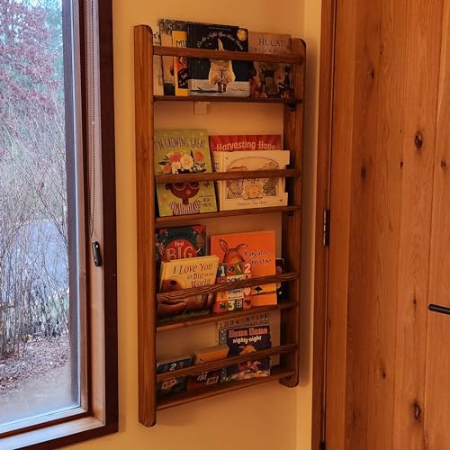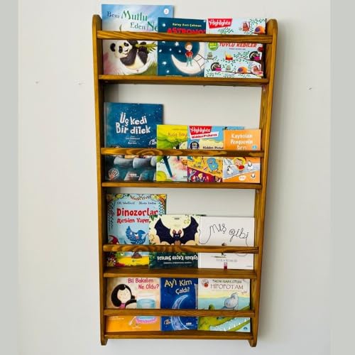 Furpinea - رف كتب يثبت على الحائط بتصميم مونتيسوري، مصنوع يدويا من خشب الصنوبر الصلب من 4 طبقات لغرفة نوم الأطفال وغرفة المعيشة، خزانة كتب الحضانة، منظم كتب من خشب الصنوبر الصلب، لون كستنائي