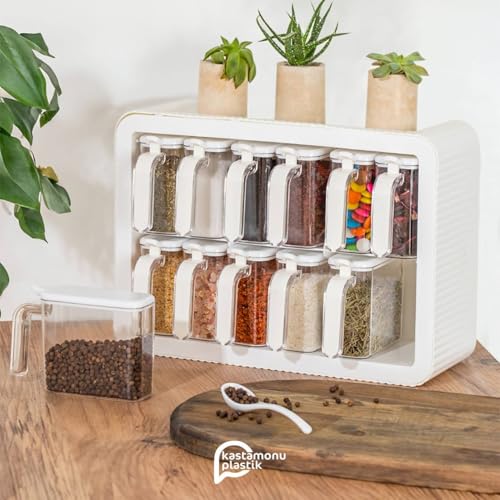 - تخزين منظم: تصميم من طبقتين مع 9 برطمانات في الصف العلوي و3 برطمانات أكبر في الصف السفلي لتنظيم التوابل بكفاءة