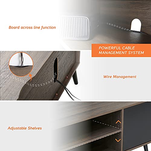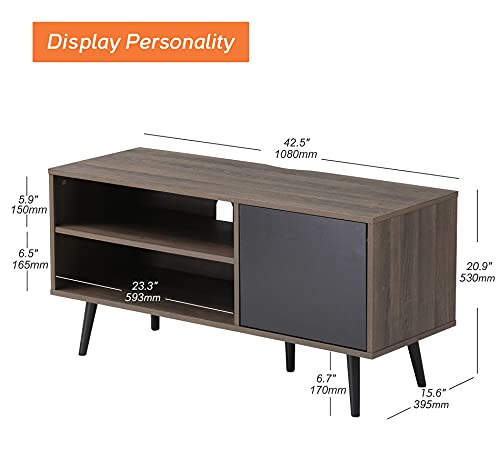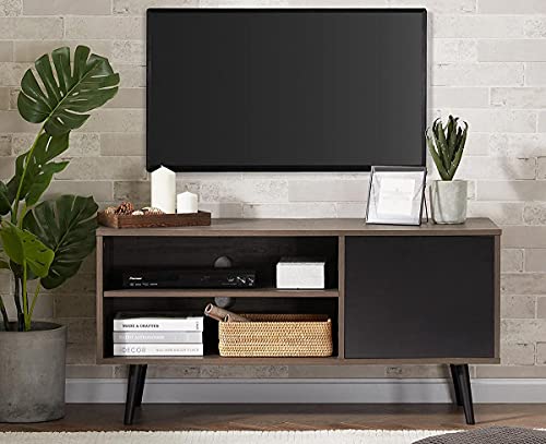 WAMPAT - حامل تلفزيون بتصميم منتصف القرن للشاشات المسطحة مقاس 32/43/50 بوصة من وامبات، ترابيزة خشب ريترو وحدة تحكم وسائط كلاسيكية لغرفة المعيشة، مركز ترفيه صغير مع ارفف تخزين وباب للشقة، اسود وبني، 43
