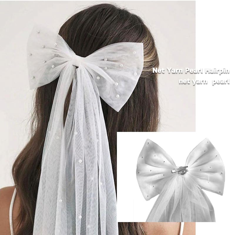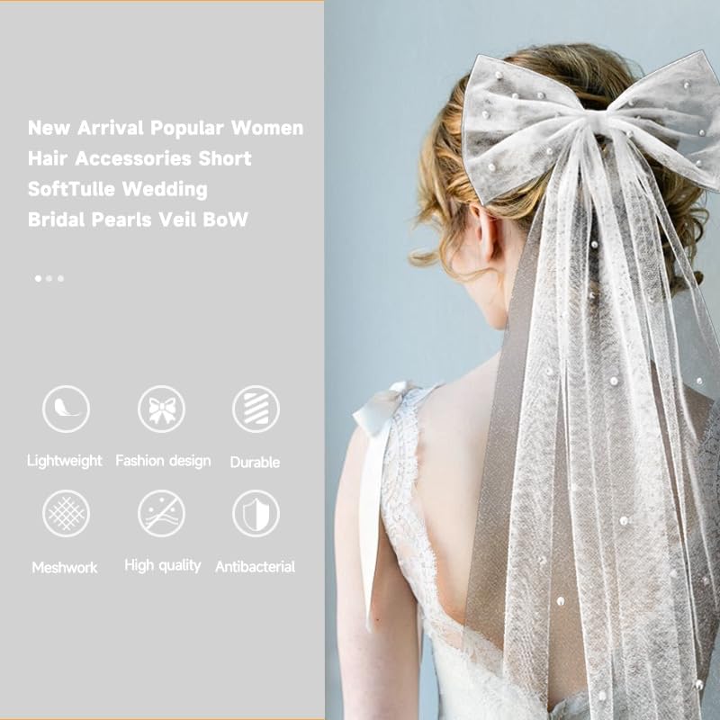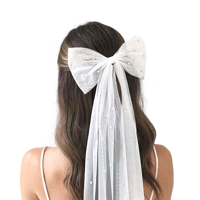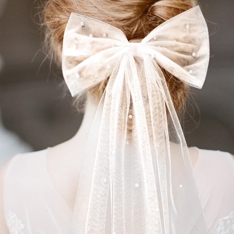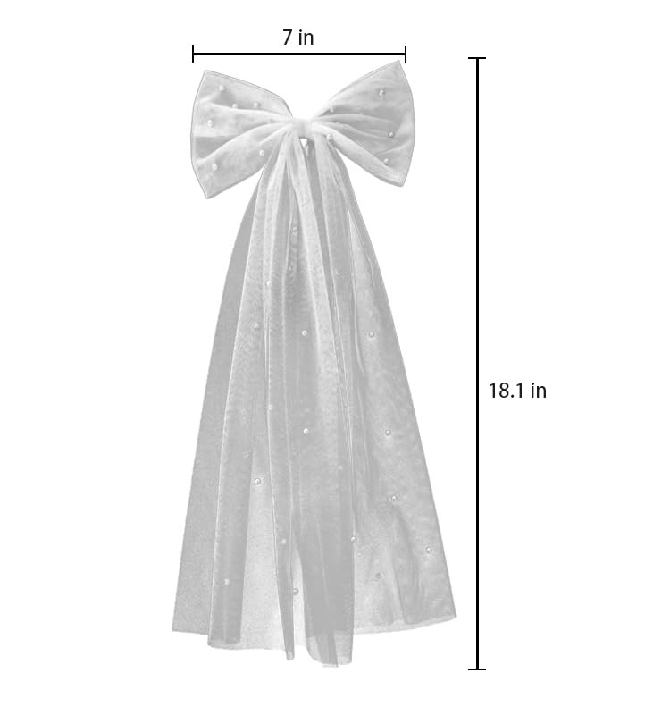 - 【وشاح مزين باللؤلؤ على شكل فيونكة】 مشبك شعر يستخدم كطرحة زفاف مصنوع من التول الناعم واللؤلؤ. طرحة زفاف بمشبك رائعة وناعمة ومنسدلة. لا تسقط اللآلئ بسهولة وستكون مناسبة للاستخدام لفترة طويلة. ابتكري تسريحة شعر أحلامك ليوم زفافك أو شهر العسل اللطيف.
