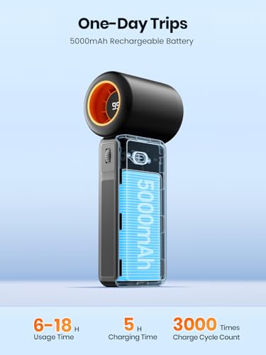 - [عرض رقمي - تنبيه بالطاقة] تشمل على شاشة رقمية عالية الدقة HD تظهر بدقة سرعة الهواء ومستوى شحن البطارية لحظياً لتكون لديك صورة كاملة عن وضع المروحة. يدعم هذا الجهاز تقنية الشحن السريع، ويمكن تعبئته كاملاً خلال 5-6 ساعات وهو مرفق بكابل توصيل من USB نوع A إلى USB نوع C لتسهيل الشحن من مصادر مختلفة. تمتع بالانتعاش بلا انقطاع.