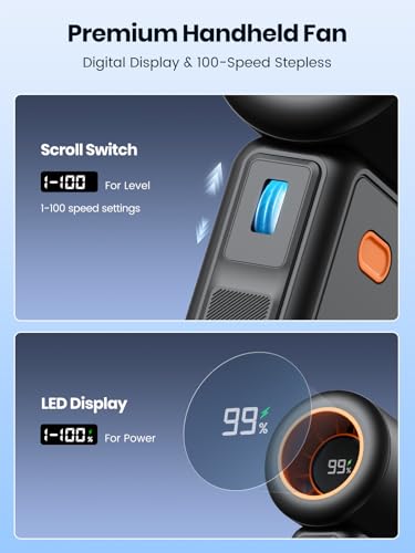 - [مفتاح دوار - سرعة رياح يمكن تخصيصها] يضم هذا الجهاز النقال الصغير مفتاحاً على شكل عجلة يتيح لك التحكم في سرعة المروحة بحرية. من نسمة خفيفة إلى عاصفة قوية يمكن ضبط سرعة الهواء بسلاسة بين 1 و100 درجة مما يوافق طلبك من قوة الهواء سواء كنت في رحلة خارجية أو تعمل داخل مكتب.