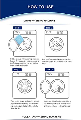 - تشغيل سهل: أضف من 1 إلى 3 أقراص إلى غسالة فارغة وقم بتشغيلها خلال دورة غسيل عادية. امسح أي بقايا متبقية عند اكتمال الدورة. مريحة وبسيطة وفعالة، لا حاجة إلى فك الغسالة.