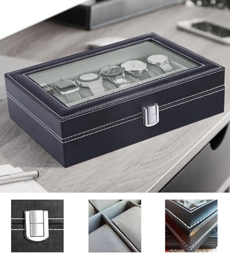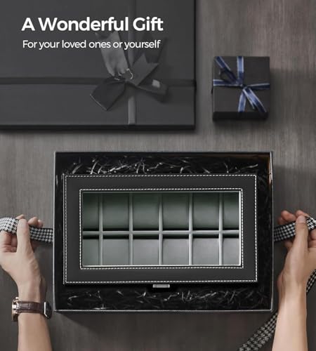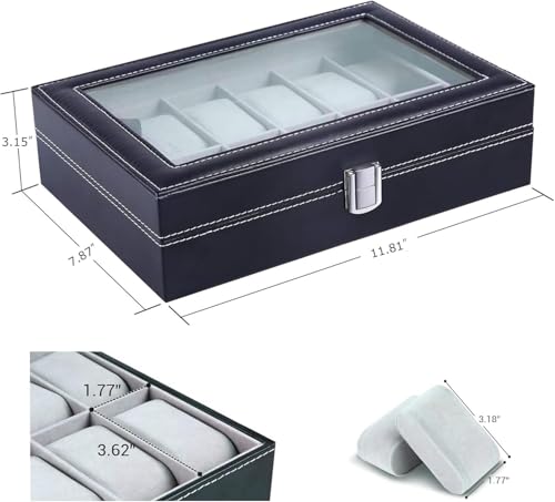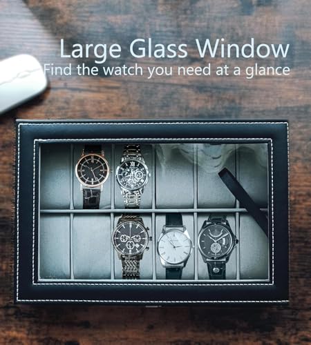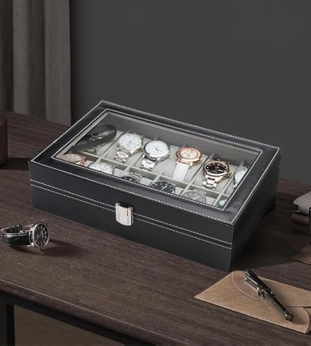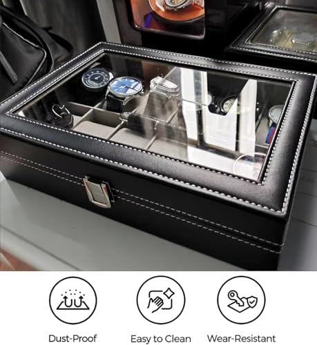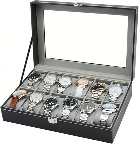 Generic - صندوق ساعة حافظة مكونة من 12 فتحة للأب منظم للزوج مع غطاء زجاجي عرض للرجال وسائد قابلة للإزالة حامل هدية عيد الأب اسود جلد