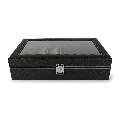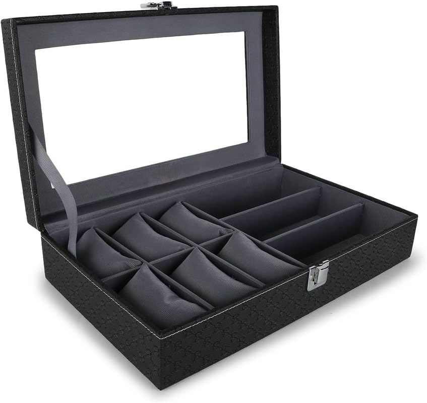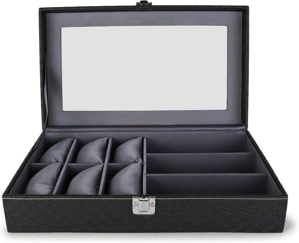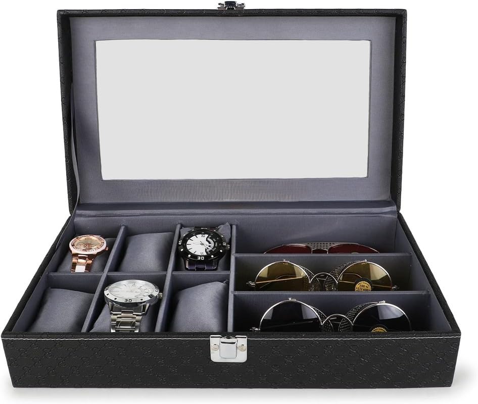 Generic - صندوق عرض منظم للساعات والنظارات الشمسية بـ 6 فتحات لتثبيت الساعات و3 أقسام، صندوق ساعات لتخزين النظارات بتصميم باللونين الأسود والرمادي ومظهر من الجلد، علبة ساعات مناسب للرجال والنساء