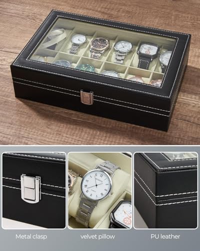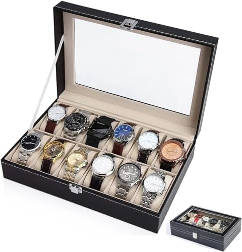 Generic - منظم ساعات بـ 12 و 10 و 6 فتحات لعرض الساعات مع غطاء زجاجي، صندوق ساعات للرجال، صندوق مجوهرات من جلد البولي يوريثين الاسود (12 فتحة)