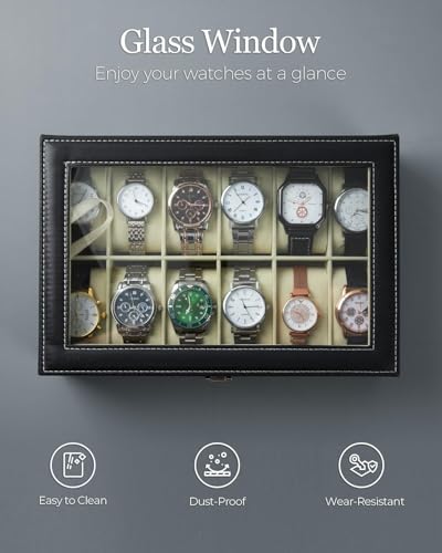 - سعة تخزين كبيرة: صندوق تنظيم ساعات بـ 12 فتحة منفصلة مع وسائد ناعمة لحماية وعرض مجموعة ساعاتك ومجوهراتك بشكل أنيق ومنظم