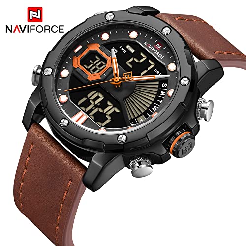 Naviforce - ساعات للرجال ساعة نافي فورس 9172L - رياضية فاخرة عسكرية عرض رقمي مزدوج التوقيت كوارتز يابانية عادية بسوار بني