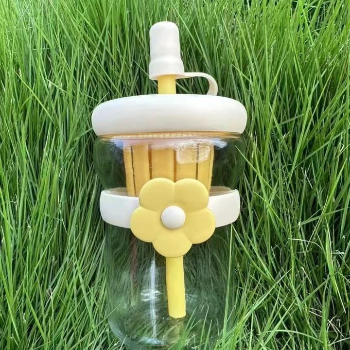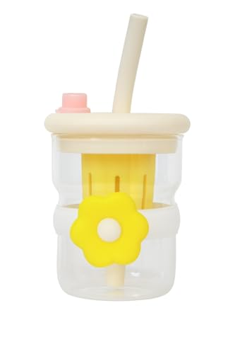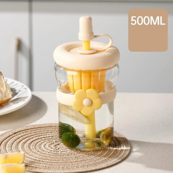 Generic - كوب ماء زجاجي مضاد للانسكاب مع غطاء مانع للتسرب خال من البيسفينول ايه بتصميم زهرة لطيفة، كوب تدريب سعة 500 مل (بيج)