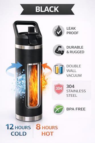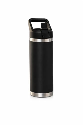 MOMSIV - زجاجة مياه معزولة بتفريغ الهواء من الستانلس ستيل بجدار مزدوج مع غطاء بقشة ومقبض للحمل مانعة للتسرب وخالية من BPA للسفر وصالة الالعاب الرياضية والمكتب والتخييم (F-1550) (اسود)