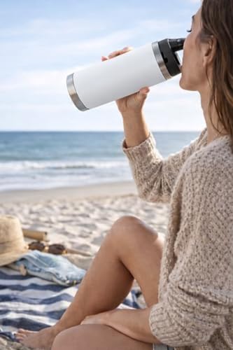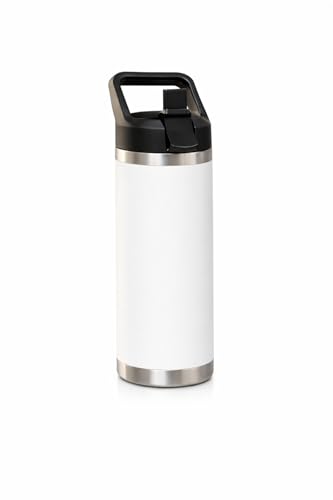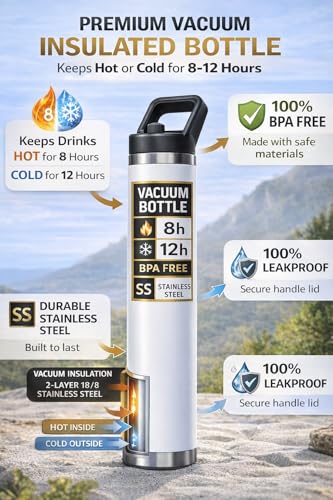 MOMSIV - زجاجة مياه معزولة بتفريغ الهواء من الستانلس ستيل بجدار مزدوج مع غطاء بقشة ومقبض للحمل مانعة للتسرب وخالية من BPA للسفر وصالة الالعاب الرياضية والمكتب والتخييم (F-1550) (ابيض)
