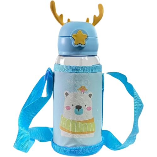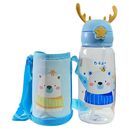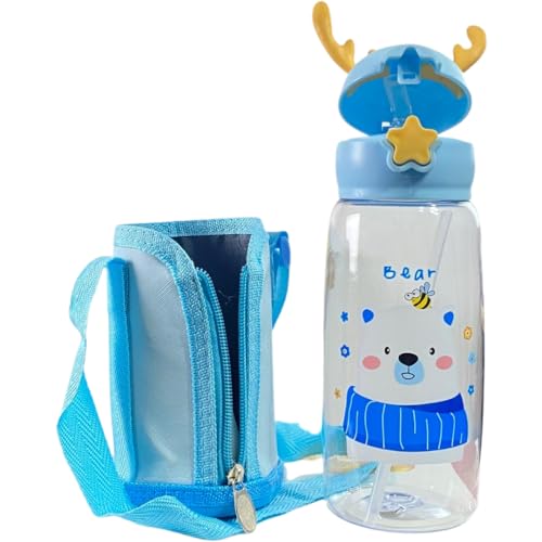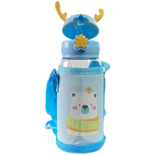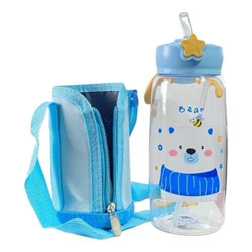 Generic - زجاجة مياه مع شفاطة سعة 600 مل خالية من مادة البيسفينول أ مانعة للتسرب وغير سامة للشرب مع حامل بسوستة، وحزام كتف قابل للتعديل بتصميم كرتوني لطيف محمول للأماكن الخارجية (دب أزرق فاتح)