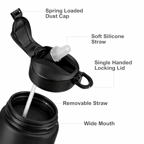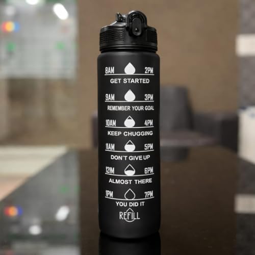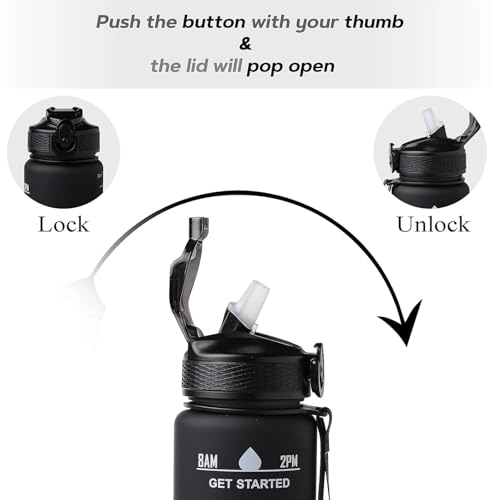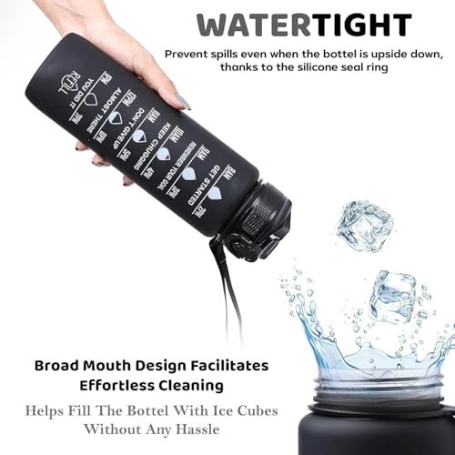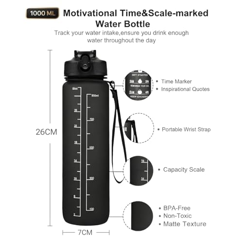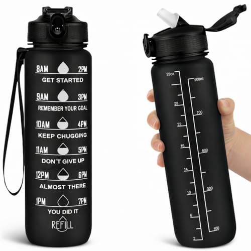 Generic - زجاجة مياه مع ماصة - زجاجة مياه تحفيزية سعة 1 لتر - خالية من البيسفينول ايه ومضادة للتسرب وغطاء علوي قلاب | حزام نايلون وعلامات للوقت | لصالة الالعاب الرياضية والترطيب اليومي (اسود)