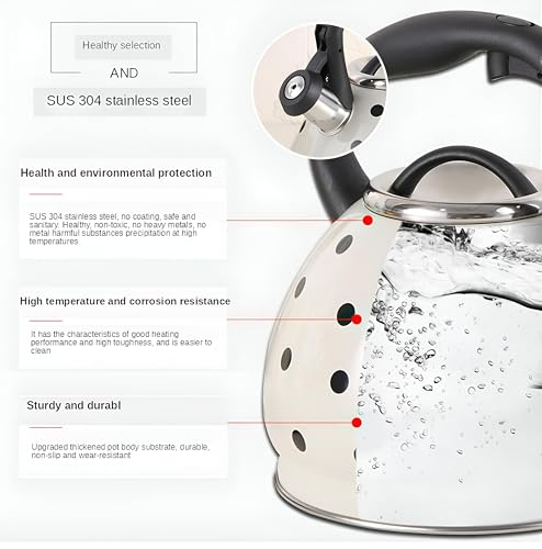 • 3. صفارة مدمجة: تأتي هذه الغلاية مع صفارة مدمجة تصدر صوتًا عاليًا، مما يضمن سماعها من الغرف الأخرى بمجرد غليان الماء. تتيح لك هذه الميزة المشاركة في أنشطة أخرى، أو الاسترخاء، أو مشاهدة فيلم، أو الاستماع إلى الموسيقى دون الحاجة إلى التحقق باستمرار من الغلاية، مما يعزز الراحة في روتينك اليومي.