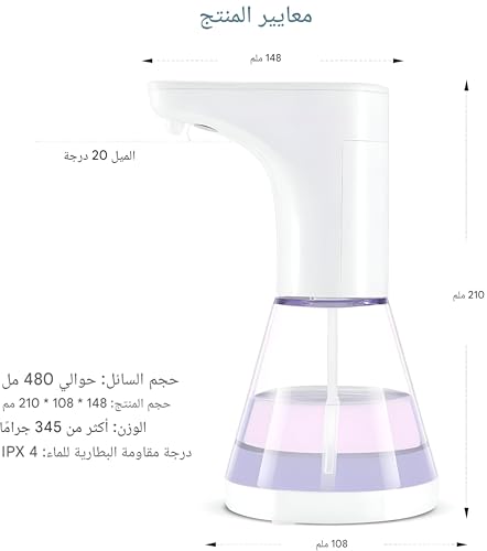 - يبلغ قياس موزع الصابون الأوتوماتيكي هذا 21.0 × 14.8 × 10.8 سم ويزن 345 جرامًا فقط، وهو صغير الحجم وخفيف الوزن، مما يضمن سهولة وضعه في أي مكان تحتاجه. يعمل بـ 4 بطاريات AA (غير متضمنة)، مما يوفر مرونة في وضعه دون قيود المنافذ الكهربائية. هذا يجعله إضافة متعددة الاستخدامات لروتينك الصحي، سواء في المنزل أو في الأماكن التجارية، مما يعزز الصحة بشكل فعال من خلال التكنولوجيا الحديثة.
