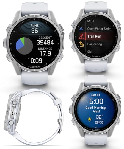 Wearable4U - وييرابل 4 يو ساعة ذكية فينكس 8 - 43 ملم، اموليد متعددة الرياضات بنظام تحديد المواقع، فضي مع سوار سيليكون وايت ستون، مصباح LED مدمج، حزمة سماعات اذن بيضاء من جارمين