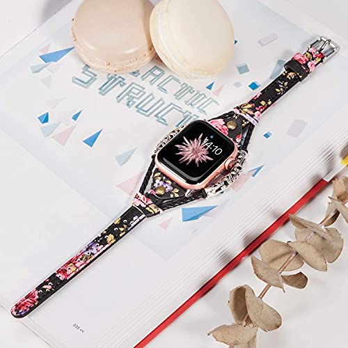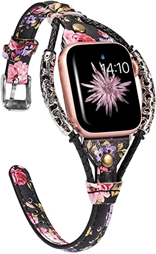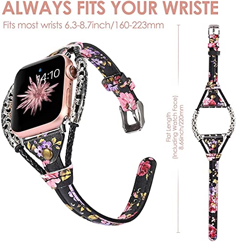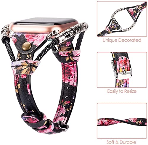Wearlizer - سوار جلد عالي الجودة صناعة يدوية handmade لساعة أبل 44 مم 42 مم ، سوار جلد بديل لساعات أبل ووتش الرياضية ، السلسلة 4 ، السلسلة 3 ، السلسلة 2 ، السلسلة 1 - اللون أسود زهري مطعم بالورد