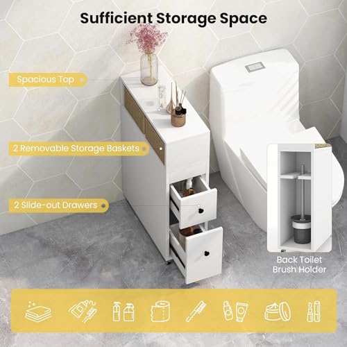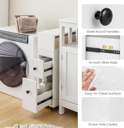 - مساحة تخزين كبيرة ومرنة: استغل السطح العلوي الواسع ودرجين قابلين للسحب لتخزين مناديل الحمام ومنتجات التنظيف وغيرها من أساسيات الحمام وفرشاة للتواليت بالجزء الخلفي للوحدة. نظم أغراضك الصغيرة بكل حرية ومرونة بفضل سلتي التخزين القابلتين للإزالة.