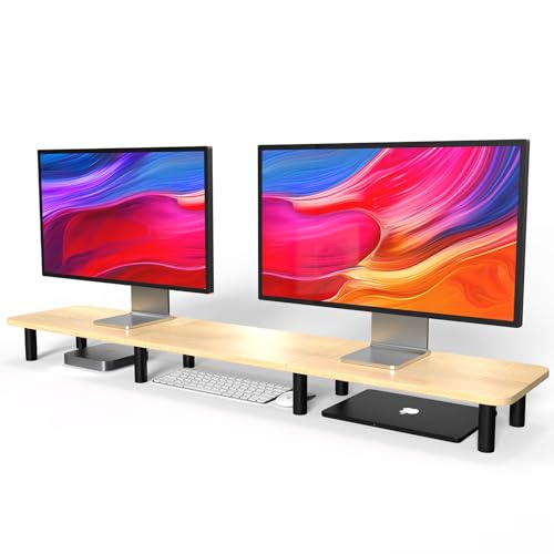 WEGASTU - حامل شاشة كبير طويل للغاية 1.1 متر من ويجاستو، حامل شاشة مزدوج، حامل تلفزيون عريض يكفي لشاشتين، حامل خشبي وأرجل ستيل بارتفاع قابل للتعديل، منظم مكتب منزلي (لون طبيعي)