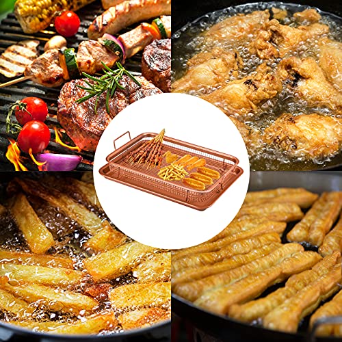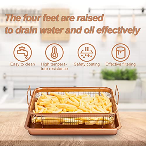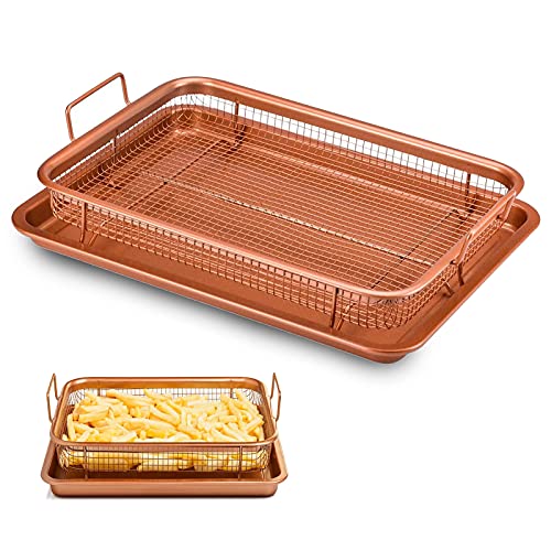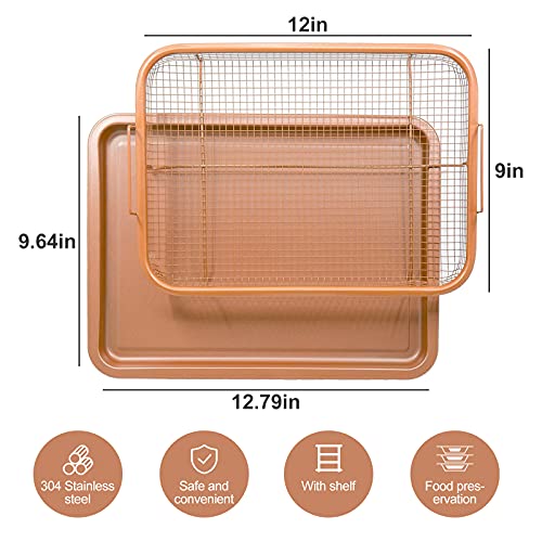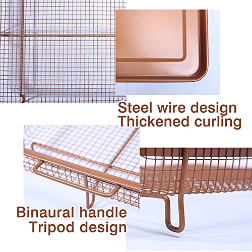 Weilianda - طقم صواني خبز غير لاصقة من قطعتين من النحاس، لتخزين المطبخ، وكمصفاة للبطاطس المقلية ومناسبة للفرن، مع رف للتصفية، صينية لحمل المقرمشات ورقائق البسكويت من ويلياندا، مقاس 33×23 سم، بلون برونزي