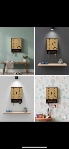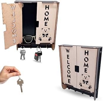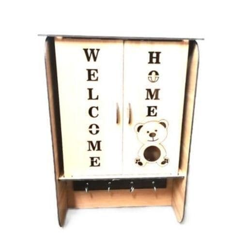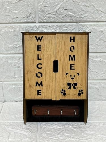 Generic - منظم مفاتيح خشبي مودرن بتصميم "Welcome Home" - خزانة حائطية أنيقة ببابين ورسومات دب لطيفة، مزودة بـ 4 علاقات معدنية متينة، قطعة ديكور عملية ومدخل عصري للمنزل والمكتب والمنشآت السكنية الفاخرة