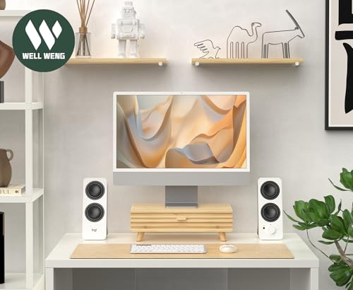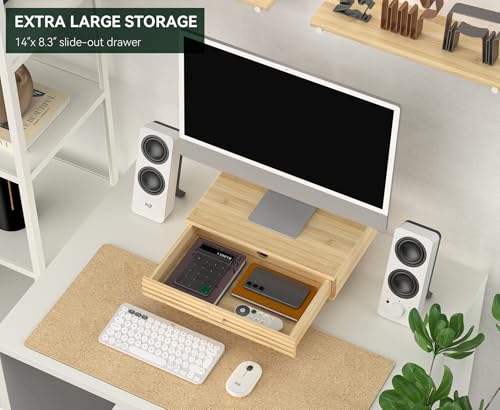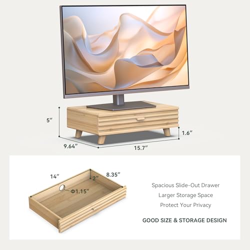 WELL WENG - ويل وينغ حامل شاشة من الخيزران مع درج - منظم مكتب مع تنظيم الكيبلات والتخزين، حامل لابتوب مريح للمكتب المنزلي (سعة 220 باوند، 15.7 انش، طبيعي)