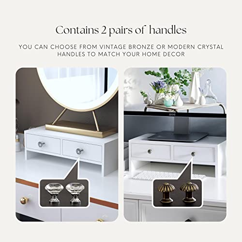 - أنيق ومتين: حامل الشاشة مصنوع من خشب الصنوبر عالي الجودة ويتضمن 2 زوج من المقابض. يمكنك استخدام المقابض البرونزية الكلاسيكية أو المقابض الكريستالية الحديثة لتتناسب مع ديكور منزلك. أيًا كانت المقابض التي تختارها، فهي مناسبة تمامًا.